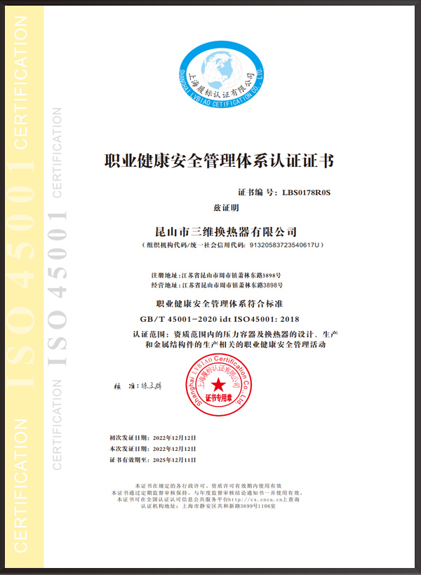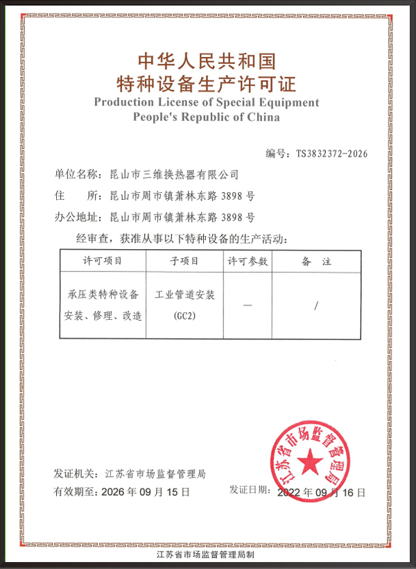 A2壓力容器制造許可證,D1/D2壓力容器設(shè)計(jì)許可證;GC2管道安裝許可證;ASME U/NB鋼印;ISO9001、ISO45001、ISO14001體系認(rèn)證證書等。